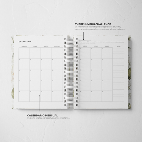 Transforma tu rutina diaria con Thepennybug Planner 2026, diseñado no solo como una herramienta de organización, sino como tu compañero en tu camino de vida intencional. Este planner va más allá de la simple planificación; te ayuda a ver con claridad, actuar con intención y celebrar tu crecimiento día a día.