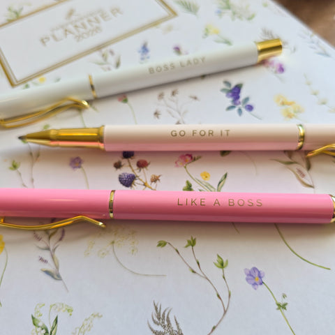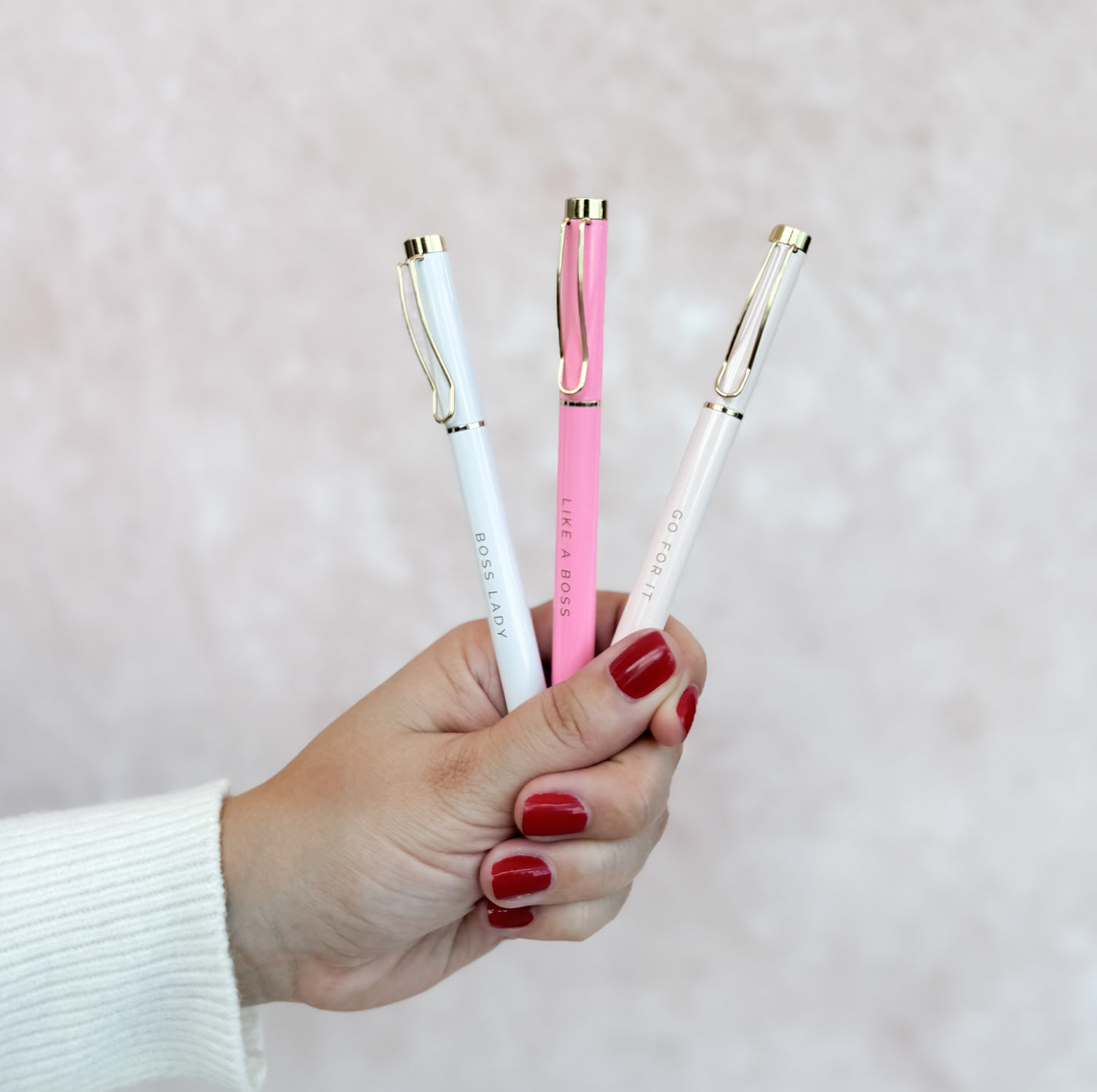 Set de 3 lapiceros con tinta negra. Están adornado con una frase motivadora, Boss Lady, Like A Boss y Go For It, sirviendo como un recordatorio diario de confianza y motivación para alcanzar tus metas.